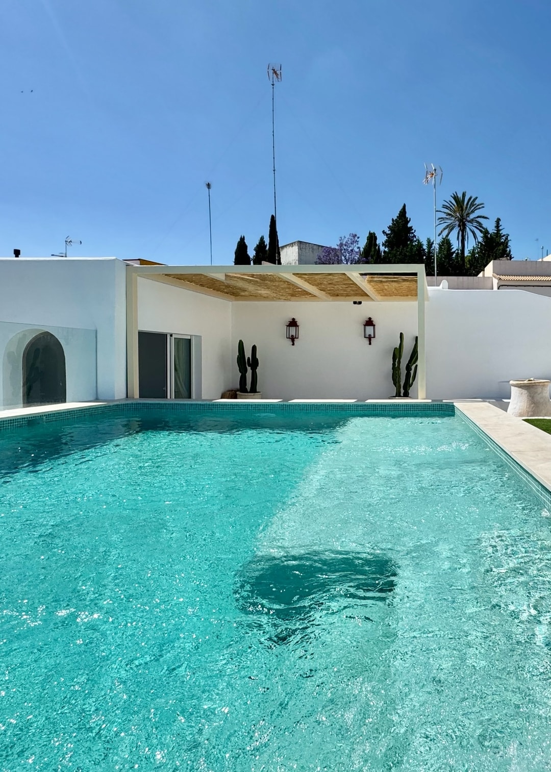 Unwind in a luxurious, modern, and eclectic house with a private pool, nestled in the historic Roman and Arabic area of Aljarafe. Just 15 minutes 11 km from Seville's vibrant downtown, this spacious, high-end home is your perfect retreat. Savor a cup of tea in the stunning private rooftop garden, thoughtfully designed with bespoke furniture by local artisans. The sophisticated interior blends modern elegance with urban flair, offering impeccable style. Enjoy year-round dips in your private pool!