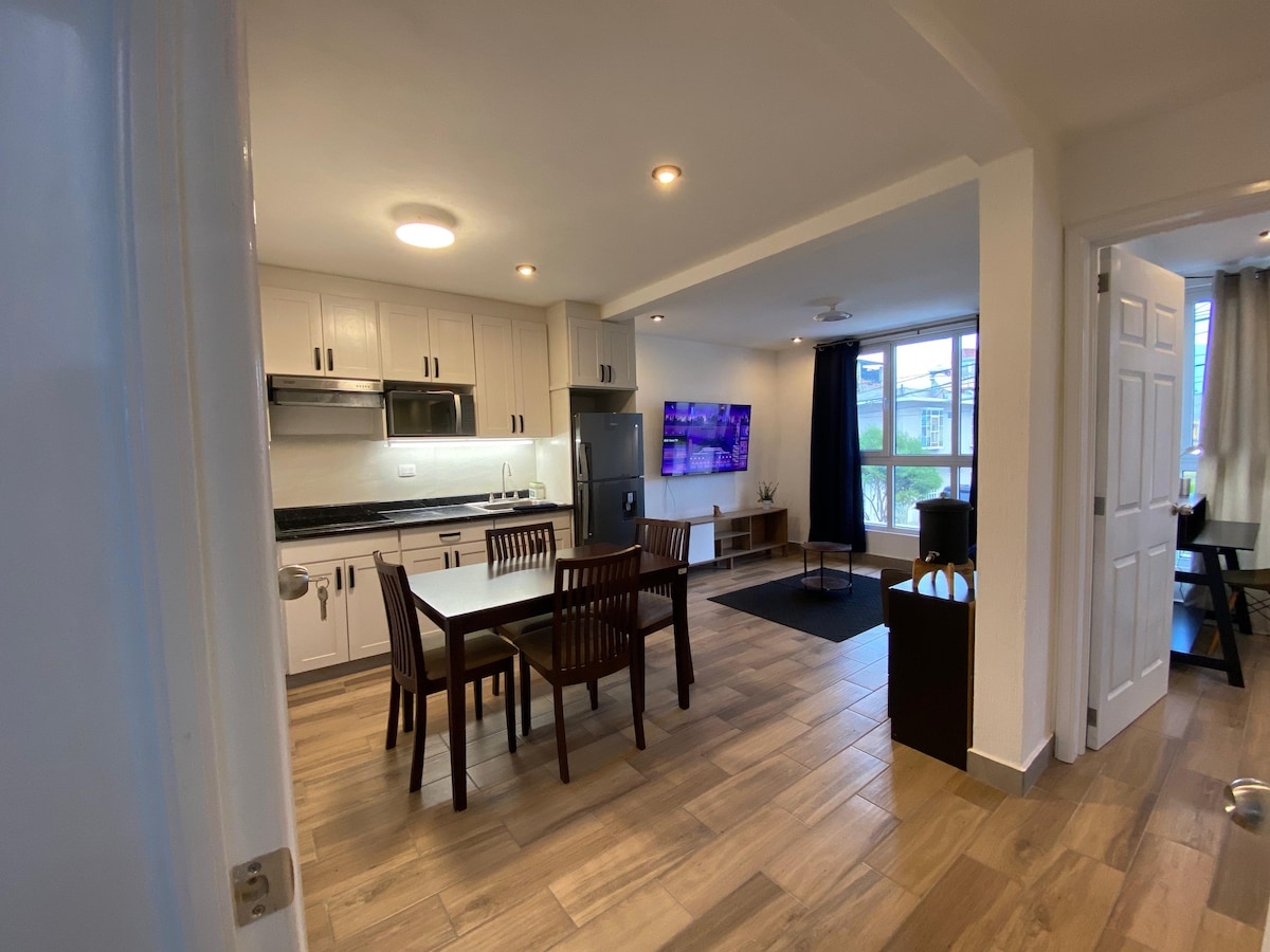 Apartamento Moderno de Fácil Acceso. Disfruta de la tranquilidad y el confort en este lindo apartamento, totalmente nuevo y equipado. Acceso fácil en el segundo nivel, dos dormitorios con camas matrimoniales, un baño completo con lavadora, una cocina moderna con estufa eléctrica y accesorios de cocina, una acogedora sala con sofá cama, un comedor y garaje para un vehículo, cuenta con una terraza con secadora y pila. Un refugio silencioso y cómodo, ideal para una estancia placentera. Te esperamos