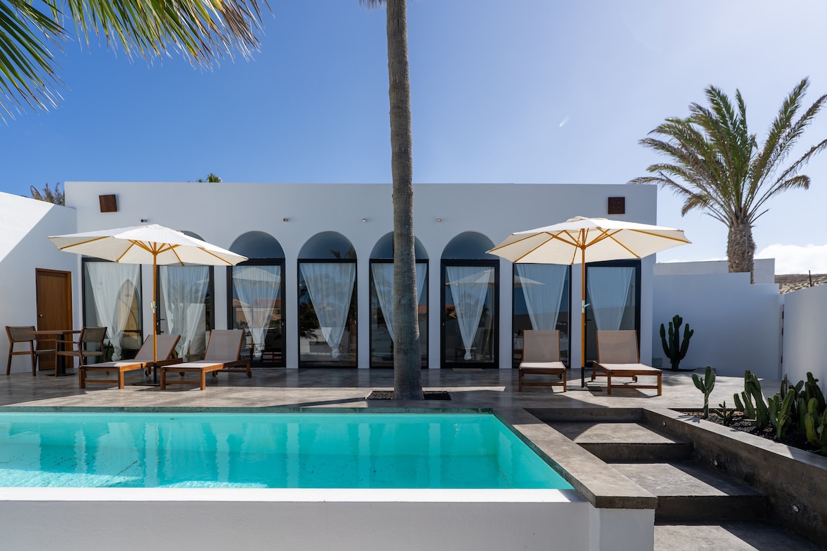 Impresionante y exclusiva villa independiente, situada en primera linea del mar, con vistas a la bahía de Corralejo, isla de Lobos y Lanzarote. Consta: en planta baja de un amplio salon y cocina, dos dormitorios, dos baños, jardín con terraza y barbacoa, y patio con porche y en planta alta de una suit con dormitorio, salón, baño, vestidor y zona chillout con solarium. Mi alojamiento esta ideal para parejas, aventureros, familias (con hijos), y grupos grandes.