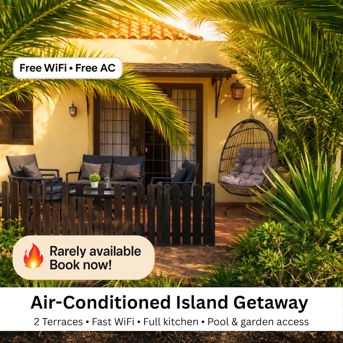 🌴 Bright and stylish bungalow just 7 min from the beach! 🌞 Private terrace with sun loungers, your own palm tree and garden views. Air-conditioned living room, full kitchen, TVs with British & German channels in all rooms. Quiet yet central location, perfect for couples, seniors and families. Self check-in, free parking, shared pool, tennis court and a popular pool bar with daily specials, live music and karaoke just steps away.