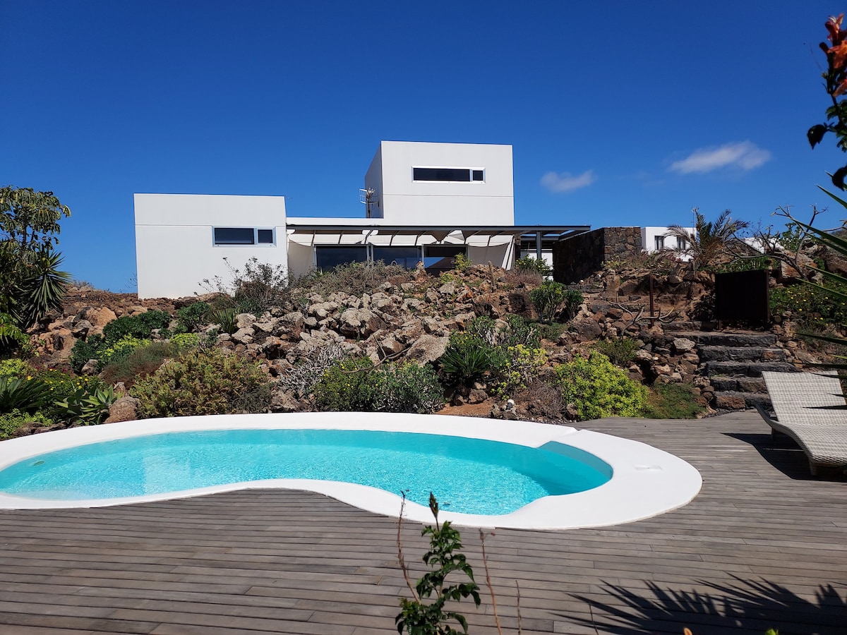 Stunning, unique villa with a fabulous heated pool and water slide in a beautiful garden setting. Calm, relaxing and totally private. The centre of the lively village of Lajares is just a few minutes walk from the villa. Fibre optic internet.