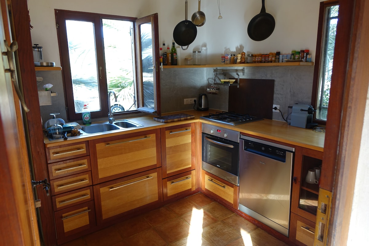Lovely 3-room house for 4-6 persons, 90 m2, with wood-burning stove. Living/dining room with satellite TV, Wifi/Bluetooth sound system. Wifi. Two bedrooms with 1 double bed each. Fully equipped kitchen - induction hob, oven, dishwasher, fridge/freezer. Bathroom with shower/WC, WC extra. Terrace 50 m2, dining table, deck chairs, barbecue. 2 children's high chairs, 2 children's beds. Access to washing machine room by arrangement for a small fee (€10.00/service) or free for longer stays;