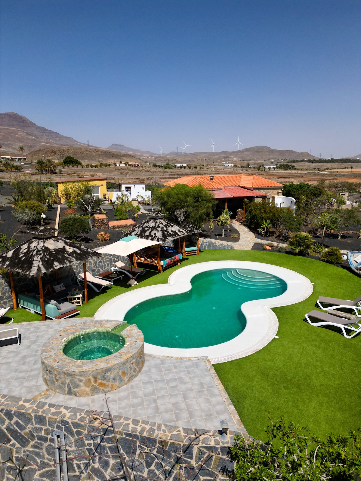 Villa Maras by Kantuvillas Fuerteventura Indulge in the jetted Spa or sunbathe in the stylish cabana while the kids enjoy the playground. Cool off in the large 8m heated pool, then dine alfresco with breathtaking ocean views from the garden terrace. Inside, beautifully decorated, spacious, air conditioned* and well-lit rooms offer a serene retreat. Wrap up the day with a lively pool match or stargazing under the clear skies. Just 15 min walk to a golden sand beach and a vibrant Shopping Centre.