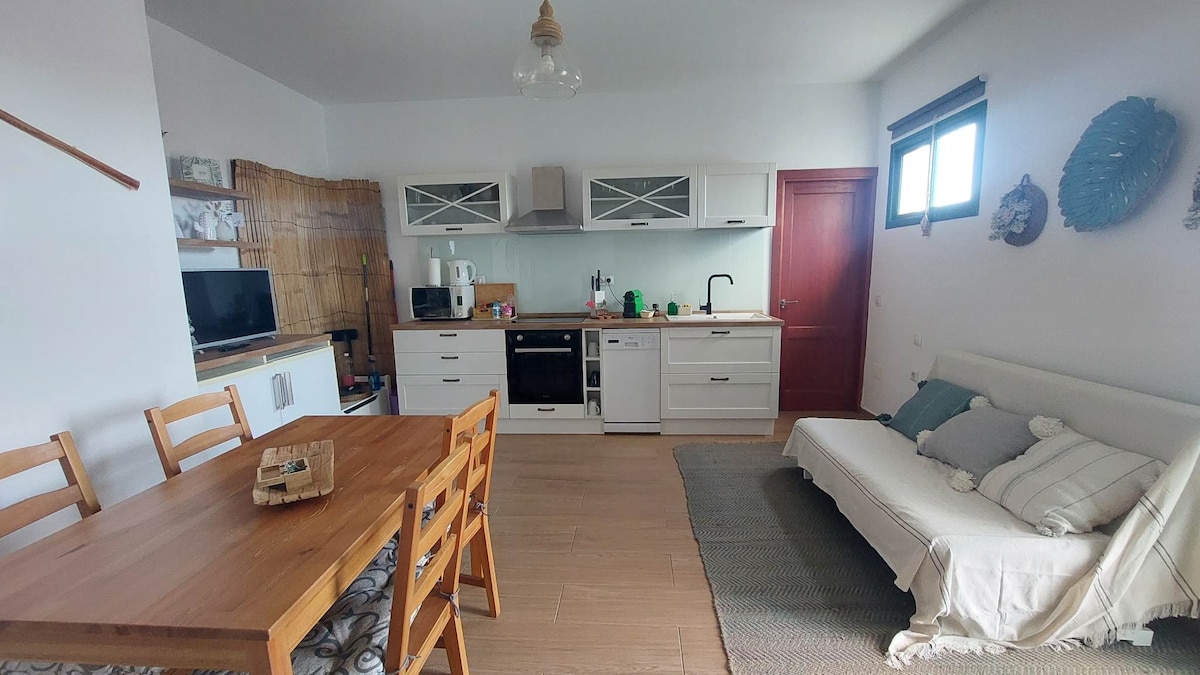 This cute apartment is located in the idyllic surfing village of Lajares. It comfortably fits two but have enough space for 4. It has a big bathroom, kitchen,living room with a sofa-bed and double bed. It has a separate terrace with gorgeous views. Swimming pool available for all guests. Ideal for couples, friends or families who really want to take a break from the everyday hustle and bustle, noise and light pollution. Apartement is situated in idyllic surfing village of Lajares, in the northern part of Fuerteventura, near the most attractive locations for surfing, kitesurfing and windsurfing (Distance 6-10 km). This is the HEART of the island's surfing community, within easy reach of the north-shore waves and also a central launch point for the east and west coast. In the village you will find everything necessary for survival: pharmacy shop, bakeries, confectionery, restaurants and an authentic surf, kite & windsurf shops. Enjoy free swimming pool access, free wifi, free parking. Interaction with other guests at the swimming pool area and central patio. Breathtaking views to the nearest volcanos, very peaceful location, direct access to running, treking and mountain bike paths.