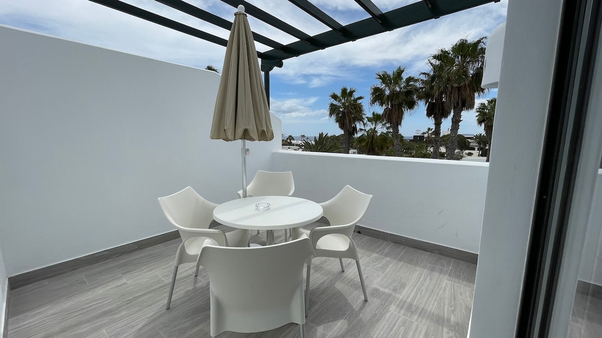 One-bedroom apartment with air conditioning and spectacular sea views. Private bathroom with shower, towels, and hairdryer. Living room - kitchen and terrace with outdoor furniture and solarium with loungers. Just a 2-minute walk to the beach. The apartment includes a safe, washing machine, fully equipped kitchen, microwave, bed linen, iron, Nespresso, and free high-speed Wi-Fi. Crib and high chair available upon request at no extra cost. *Includes cleaning and beach towels.