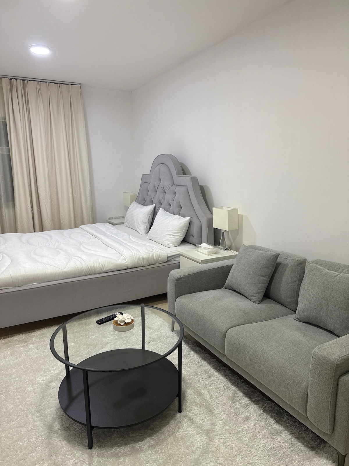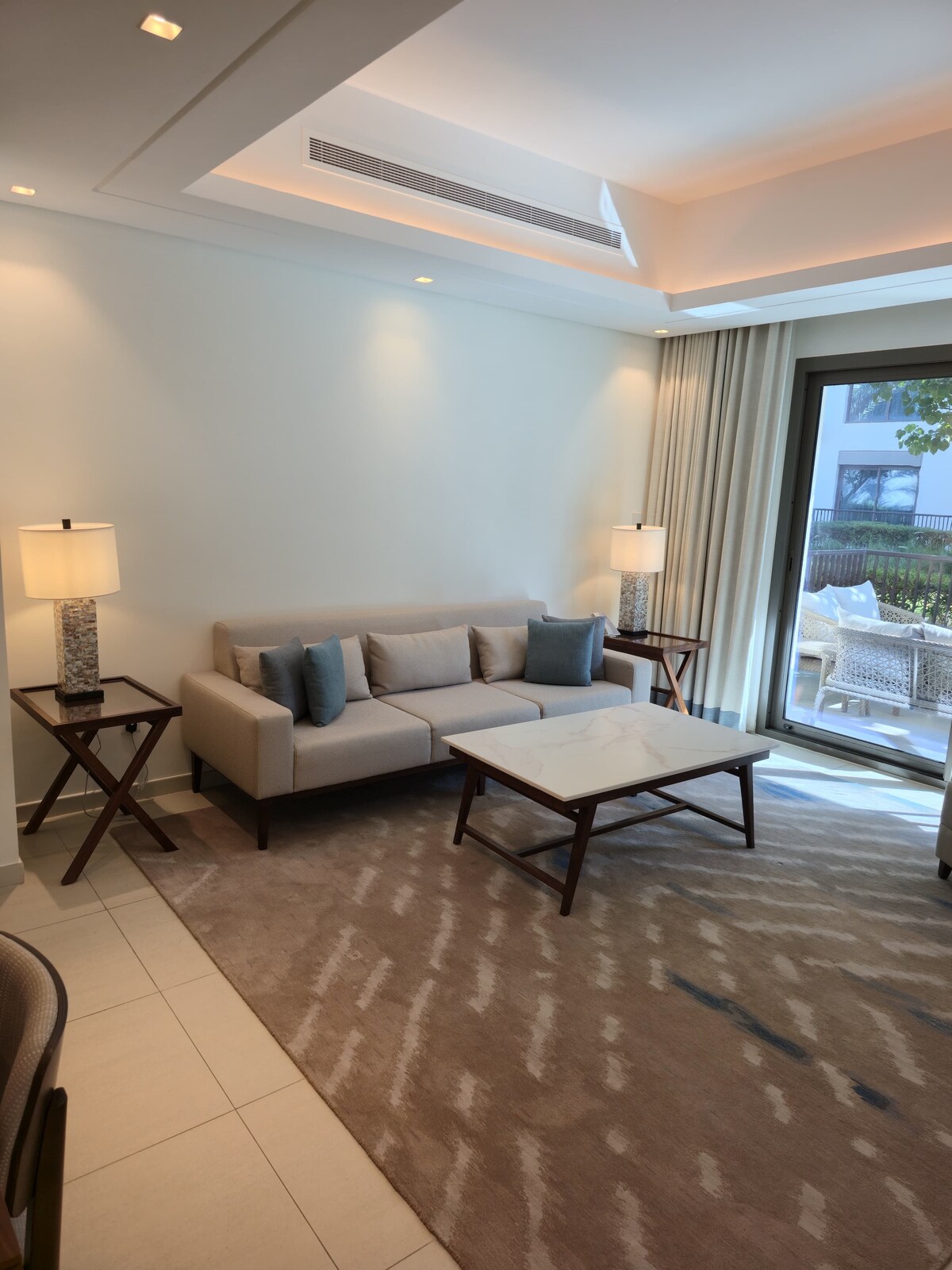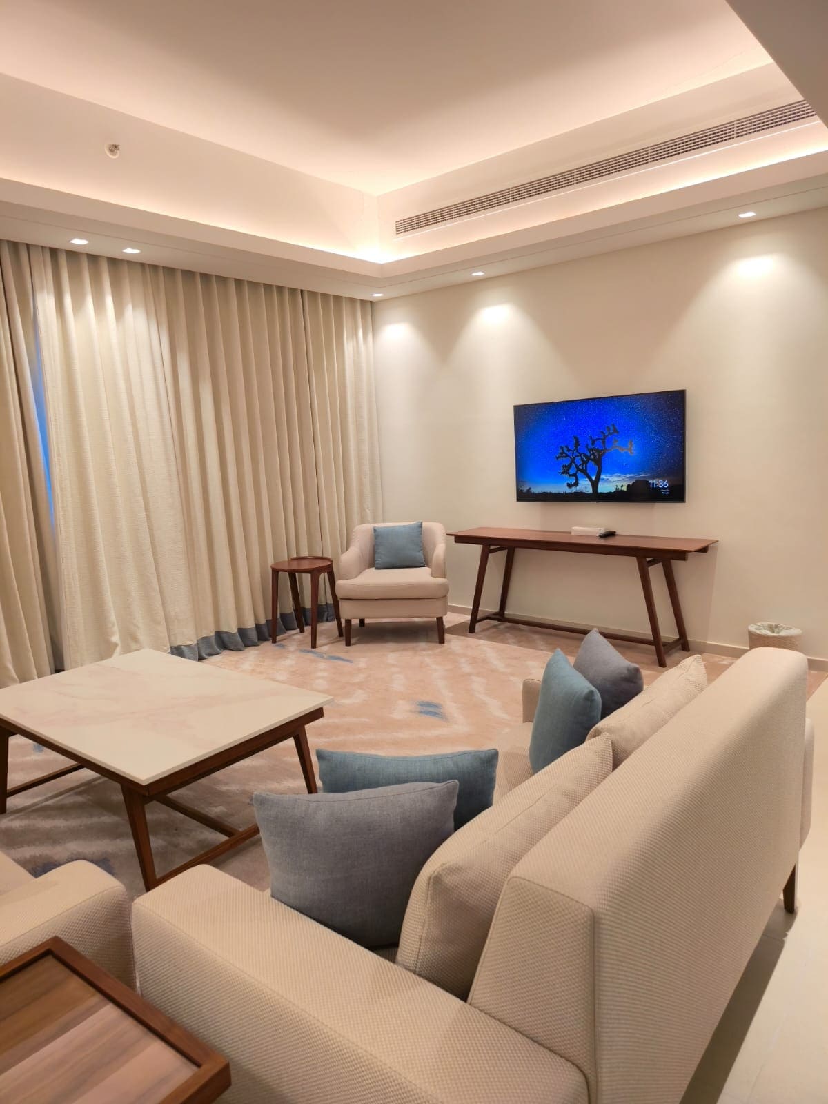 My apartment has 1 room with a king bed for 2 people, and a room with a twin bed for 2 people, and 1 small room with a small bed for 1 person, all rooms include a bathroom, and one bathroom is available in the living room, it includes comfortable sofas. In addition a pantry is available with all needed cooking and serving equipments. My Apartment is a part of The Adress Fujairah Hotel, Alaqah. My apartment is on the ground floor where you can enjoy the balcony