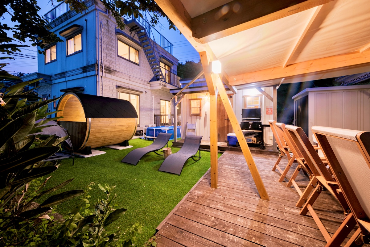 Rent this whole house, with Private Hot springs! New built on 2022 autumn, for comfortable staying of Airbnb guests! 100% natural flow of fresh hot spring, it is available on 24 hours for your group only. 5min walking away from a convenience store and 6min to a bus stop(Directly access from HanedaAirport!) Bed is traditional style of Japanese Tatami. Kitchen is fully installed and you can enjoy BBQ on the outside garden area. Bicycles are provided(NEW!) Suite for one or two families!