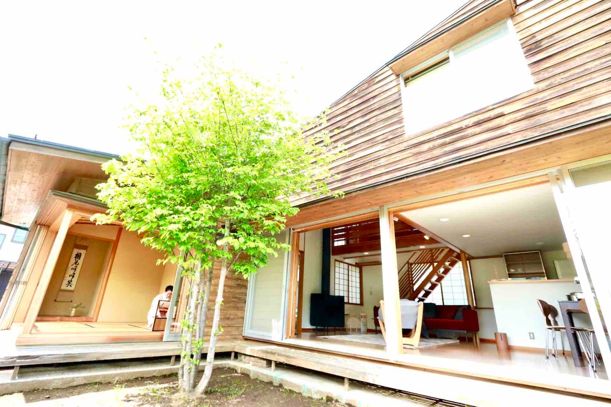 道志村私人别墅,配有木制露台、燃柴火炉和宽敞的花园,即使下雨也可以烧烤