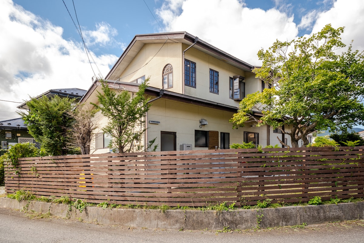 富士山の麓の緑に囲まれた戸建離れです。6畳が2部屋あります。冬期はコタツ有。無料WIFI・ワークスペース・冷蔵庫・トイレ・お風呂・BBQ等々必要なものはそろっております。エアコンは2台ありで快適に過ごすことができます。BBQ設備・焚き火台もあり、自然を感じながらのんびりと過ごすことができます。 旅館の離れをAirbnbで貸しており、別棟に自宅もありますので、様々な対応が可能です。 2024年10月トイレ・バス・畳を改装。 自転車を無料で貸出しています。 ※BBQ・焚き火ご利用の方は、事前にその旨ご連絡ください。使用料等として、1000円/1人(当日現金)いただきます。網・鉄板・炭・焚き火用材木・着火剤・チャッカマン・蚊取り線香・皿・箸・軍手・トング・ヘラ・調味料等基本的なものは全てあります。食材のみご用意ください。テラスには屋根がございますので、雨天でも問題なくBBQ可能です。 ※ペットは小型犬・中型犬可です。¥2000/1頭/泊いただきます。ケージ等あります。 ※プラスチック資源循環促進法により、使い捨て歯ブラシは置いておりません。歯ブラシはお客様のものをご用意ください。