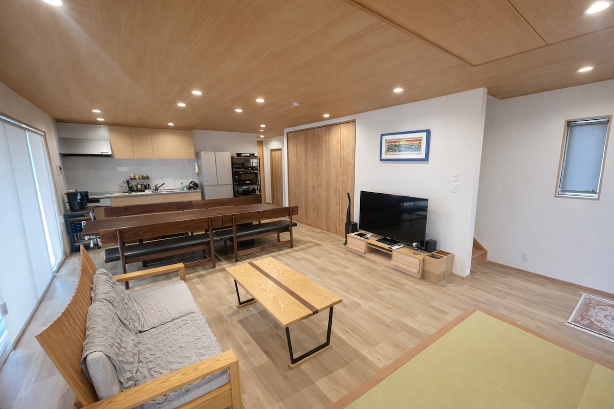 Relax to the sound of Itadori river and take a swim or SUP boarding. Awake to bird songs with the whole family or friends at this peaceful bungalow and spacious traditional Japanese garden with three maple trees and sixteen pine trees. There’s a garnet stone table with seating a fire pit and bbq a 10 meter long hammock to lay under the stars at night sky or relax in the day. Only 3 minutes on foot to Monet’s Pond, 10 minutes to 21st Century Park by car and 15 minutes to Itadori Hot Springs.