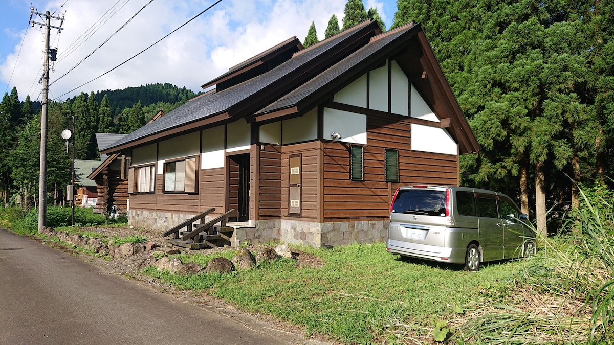 It is a log house in Hakusan city .you can use outside bath and inside bath are use natural hot spring. About this area, Recently it has been certified as a UNESCO Global Geopark.There are national parks, ski resorts, hot spring Places ,organic restaurants and cafes nearby. It is also about 30 minutes to Kanazawa, and has good access to the World Heritage Site and Shirakawa-go. I have Eabikes, , so even if you don't have a car, you can enjoy this area. Pleaee have a relaxing time in here !
