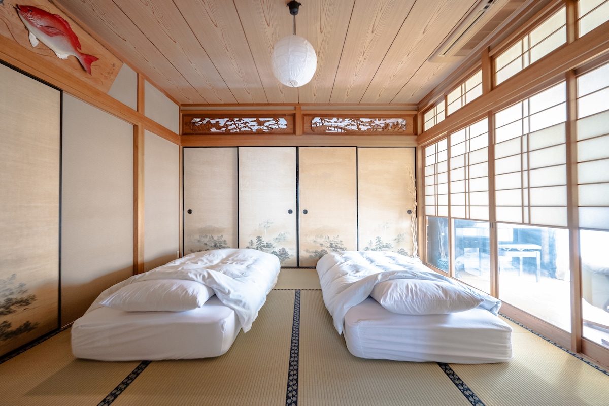 Newly constructed detached villa, 1minutes walk to beach! You can see the ocean as soon as you leave the house!You can have a BBQ! Now accepting reservations at discounted rates! Reservations accepted up to 6 months in advance / 10% off early bird and last minute discounts! Weekly discount 10% off/Monthly discount 20% off/Recommended for family trips/sightseeing trips/long-term trips 5 parking spaces on site Accommodates up to 10 people 6 Simmons beds + sofa bed 2 toilets/2 sinks/1 bathroom