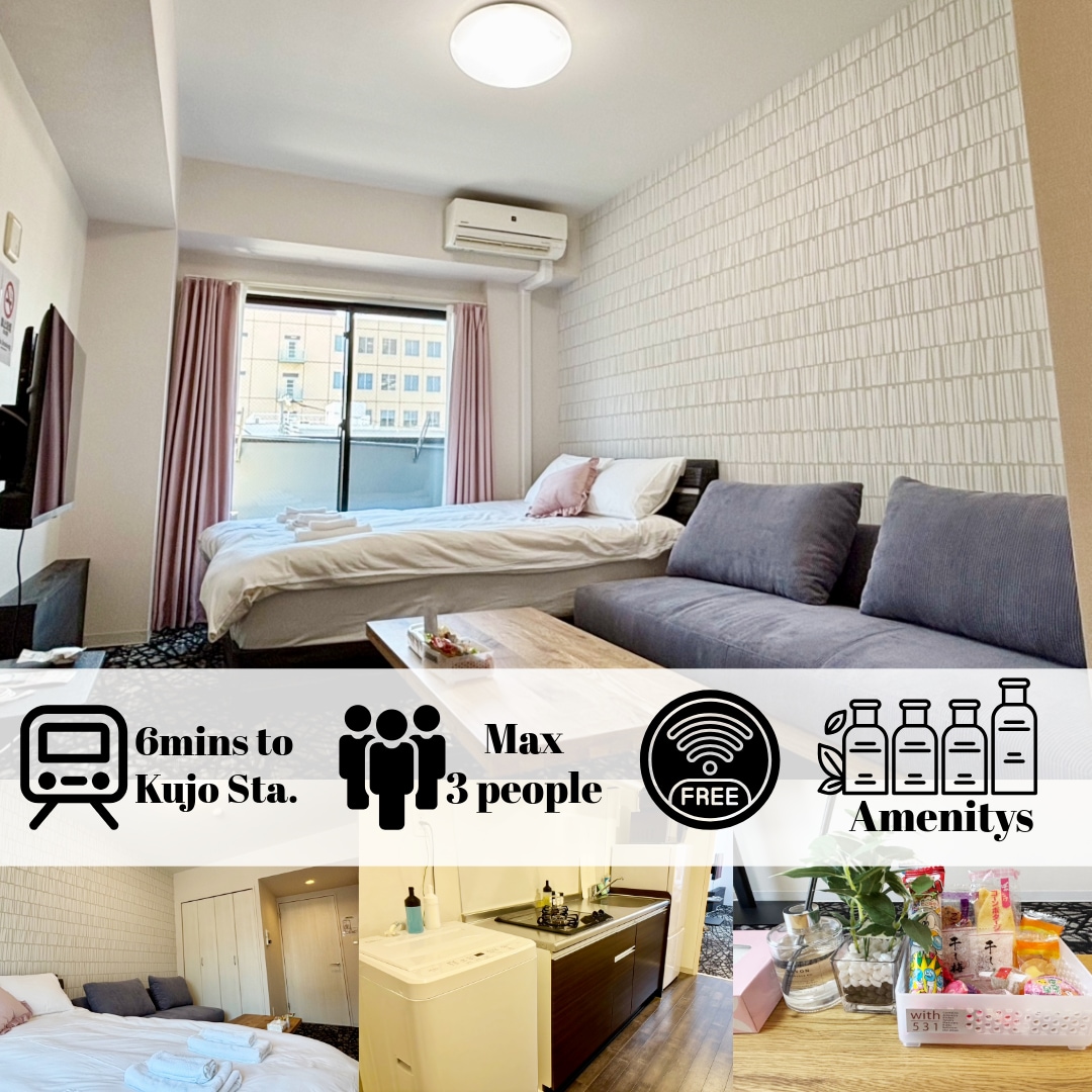 这是一间设计师风格的1LDK28.8㎡公寓。距离阪神难波线和大阪地铁中央线的九条站仅步行4分钟,乘坐阪神电车到难波站仅需3站,7分钟,到达关西机场只需一次换乘105分钟。从阪神九条站到环球影城只需一次换乘21分钟。步行15分钟即可抵达京瓷巨蛋大阪。位置优越,可轻松抵达大阪旅游的中心地带,如南部地区,心斋桥,新大阪和其他著名景点。附近有九条商店街等多个商业区,方便您享用美食、购物和观光。 这间公寓由知名设计师设计,拥有舒适的居住空间。 特点: -位于安静的住宅区的设计师风格的1LDK公寓 -最多可容纳4人入住 -步行1分钟即可到达超市和便利店 -配备基本烹饪设备 -整套出租 -自助入住系统 -免费洗衣机(提供免费洗衣液) -提供充足的洗浴用品(洗发水、护发素、沐浴露、浴巾、拖鞋、牙刷、化妆棉、棉签、剃须刀) -支持日语、英语、中文 -高速WiFi覆盖