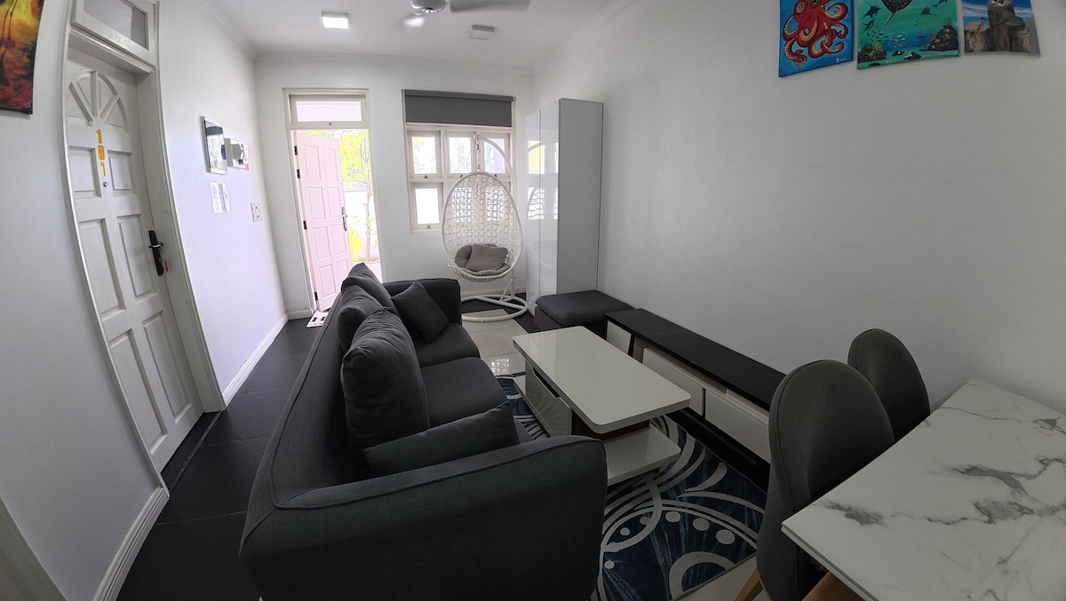 Manta Sky Inn, located in B. Dharavandhoo is a newly opened guesthouse registered in the Republic of Maldives. Manta Sky Inn is a family guesthouse and offers access to a green, pleasant backyard , The 4-bedroom guesthouse features air-conditioned rooms, a minibar and flat TV, a living room, and a comfortable garden seating area where you can relax and unwind. We serve a complimentary buffet with continental breakfast that your family can enjoy and savor local tastes.
