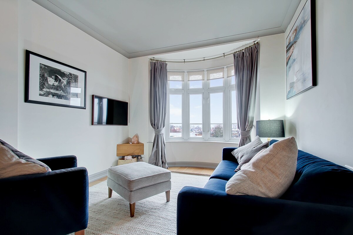A stunningly remodelled fifth-floor apartment with lots of windows and sweeping views towards the southeast. You can access this well-known and safe purpose-built serviced building via stairs or a lift. The apartment is designed with ease of living in mind, featuring a tasteful arrangement of high-end fixtures and fittings, including prime oak wood flooring, fitted cupboards and new bespoke doors. The entire interior is serene and hospitable.