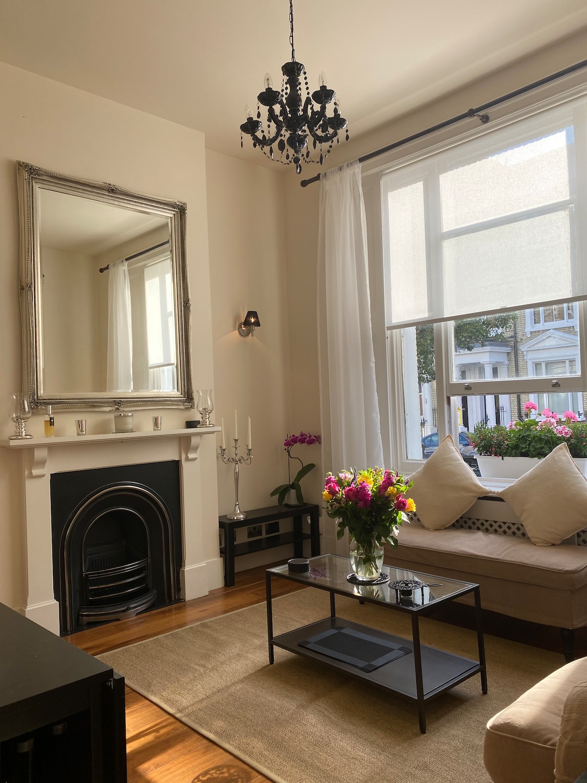 Elegant First Floor Flat close to Fulham Broadway tube giving you versatile access to all of Central London. Spacious bedroom with Super King bed and an ensuite shower room with rain shower and feature lighting. A bright and airy reception room with a sofa bed (for extra guests) and a TV with Netflix. A full equipped kitchen with oven, convection hob, microwave and Nespresso coffee machine. A south west facing terrace overlooking mature trees that lead to the park. Wifi is available.