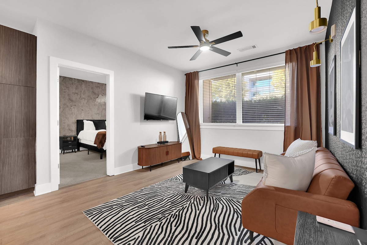 Spacious 830 sq ft, light-filled private suite! Enjoy a spotless, professionally cleaned space—we subsidize over half the cleaning cost for you! The suite offers a dedicated workspace, private entrance, and zero interaction with the main house. Perfect for traveling nurses, business trips, or Braves fans. Located in a safe, upscale area near Truist Park, Marietta Square, and major hospitals. Keyless entry, full bath, kitchen amenities, and quiet. Private patio.