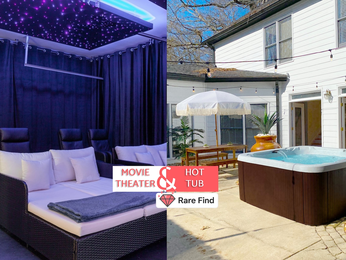 Unwind in style at our spacious 4-bedroom getaway featuring an amenity-rich experience including: a private hot tub for 7, indoor movie theater with surround sound, outdoor theater with fireplace, bar and BBQ grill for epic nights. 9 comfy beds, sleeps 16. Open living room perfect for groups Gig-speed Wi-Fi & smart TVs Chef’s kitchen & coffee bar King-size primary suite Washer/dryer for long stays Minutes to Midtown dining, parks, and skyline views. Book your luxury Atlanta retreat today!