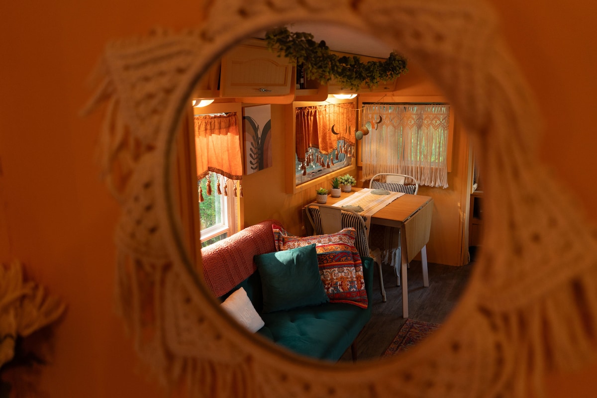 Welcome to our cozy glampsite village, where you'll be staying in this homey and charming 30 foot glamper named "Harmony". So get ready to pack your glamp bags, as the peaceful and serene Harmony awaits, to give you a private bedroom with queen-sized mattress, additional sofa bed, two recliner chairs, two tv's, wifi, full kitchen & dining and full bathroom. It’s perfect for a romantic getaway or a fun trip with a couple of friends. Outside, enjoy the hammock chair, fire pit and games.