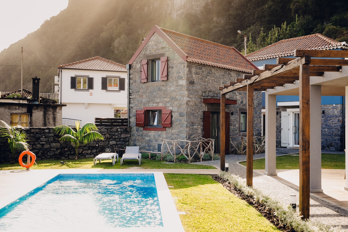 Detached house inside an Agritourism property called "Casas da Levada", with breakfast included in "do it your self" mode. From an old wine cellar, where the farm tools were kept, "Casa da Cascata" was rebuilt, keeping its original stone layout, balancing the rustic and modern line. Facing the pool, it offers an exclusive view of the Atlantic Ocean and a unique sunset from the western most tip of Madeira Island.