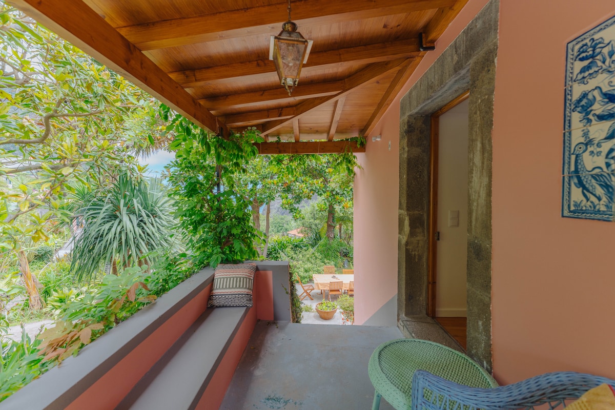 Escape to serenity in this cozy, picturesque estate nestled just minutes from downtown Funchal. Surrounded by lush greenery and towering palm trees, this peaceful retreat is perfect for couples, solo travellers, or small families looking to unwind and reconnect with nature. The spacious front balcony and courtyard invites you to sip your morning coffee while watching the sun rise over praia Formosa.