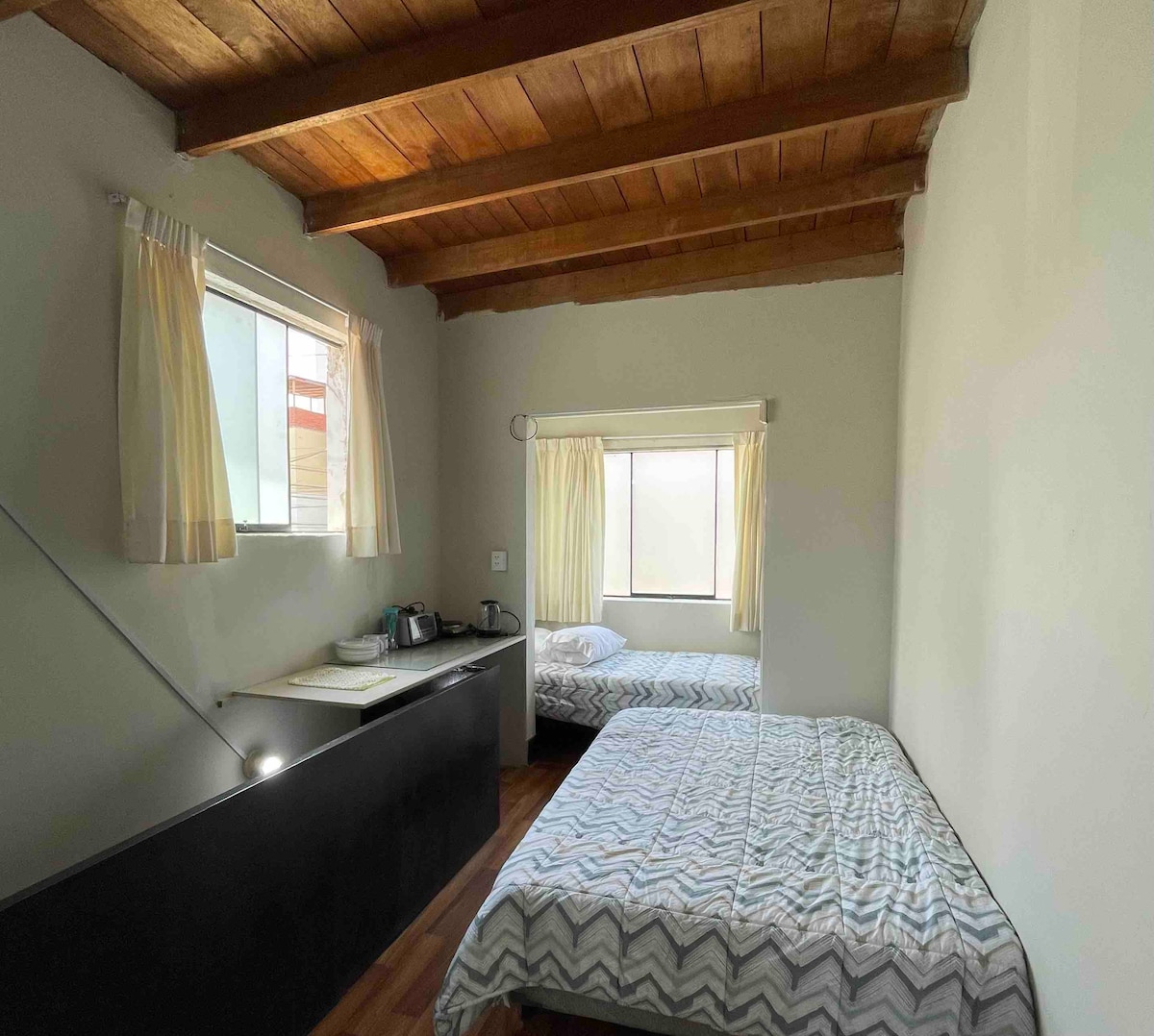 Departamento monoambiente con balcon con vista a la calle. Ubicado en Pueblo Libre a solo 25 minutos del Aeropuerto y 18 minutos del centro histórico de Lima. Cuenta 01 cama de 2 plazas y un sofa cama de 1 plaza, TV con 55" con wifi, mesa - escritorio, menaje completo, microondas, olla arrocera, plancha y planchador, hervidor electrico, refrigeradora, cocina con horno eléctrico, ventilador y terma. Baño con ducha, toallas de baño y mano. Edificio con doble vigilancia las 24 horas.