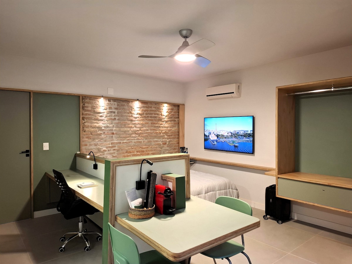 Studio com decoração moderna e vaga de estacionamento inclusa para carros pequenos. Projetado para oferecer à você uma excelente experiência, este studio possui ar condicionado quente/frio, SmartTV de 43" com Netflix. Excelente espaço home office, com cadeira ergonômica e internet ultra rápida. Cozinha equipada com taças, panelas, pratos, talheres, etc Você encontrará também: Maquina Lava/Seca, Cafeteira, Secador, ferro passar. Roupas de cama e banho inclusas.