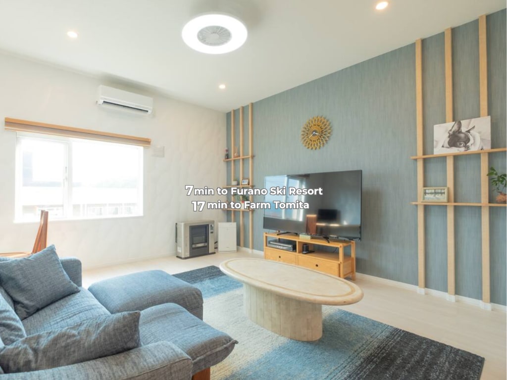 这是一栋位于富良野、被大自然环绕的安静独栋别墅。 客厅设有大窗,可眺望十胜岳连峰的壮丽景色。春季残雪、夏季薰衣草、秋季丘陵红叶、冬季雪景,四季皆可欣赏绝美风光。 距离富良野站约8分钟车程,富田农场(Farm Tomita)约15分钟,富良野滑雪场约10分钟。旭川机场约1小时,札幌约2小时30分钟,是游览札幌、美瑛、中富良野的理想据点。 3居室格局,最多可入住10人。整栋出租的度假别墅,提供完全私密的入住体验。 配备家具家电,设有半双人床、单人床及阁楼床位,适合家庭旅行、朋友聚会、滑雪旅行、远程办公(Workation)、企业培训及长期住宿(月租)等多种需求。 配备滚筒洗衣机、洗碗机、全功能厨房、高速Wi-Fi、支持流媒体的电视、全屋冷暖空调。 提供免费停车位(车库1台 + 室外多个车位)。 在这里,您可以享受如同“生活在富良野”般的舒适与自在。