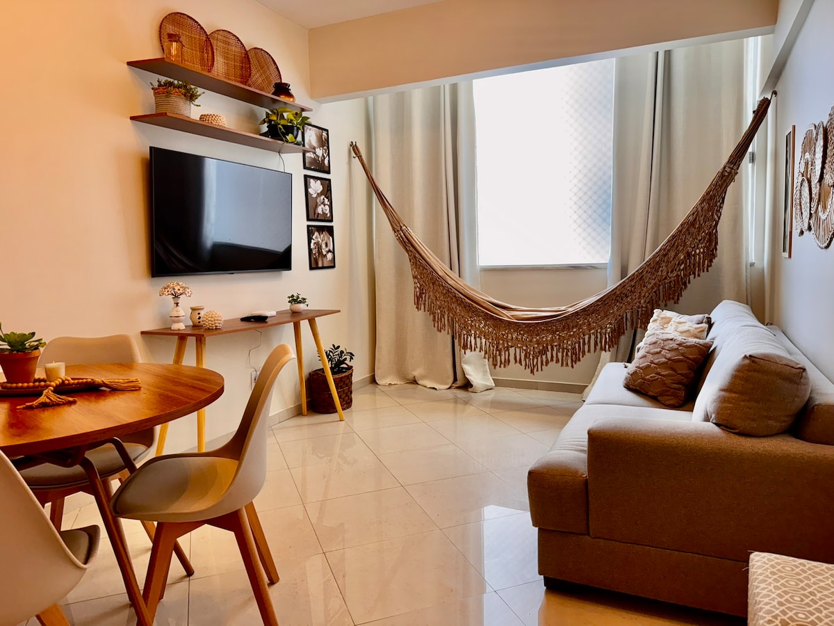 AP 1/4 moderno, aconchegante, em local seguro próximo de supermercado, shopping, bares/restaurantes, pontos turísticos andar alto, com vista, edifício com 2 piscinas, academia, hidro, sauna INCLUSO -Roupa de cama e toalhas - 1 vaga garagem - Cozinha completa - Lava louças - Maquina lava e seca roupas - Smart TV 65" c/ Netflix - Wifi - Alexa (Automação Residencial) - Cafeteiral Oster primalatte - Churrasqueira elétrica -Ar-cond no quarto e sala - Ferro de Passar - Secador