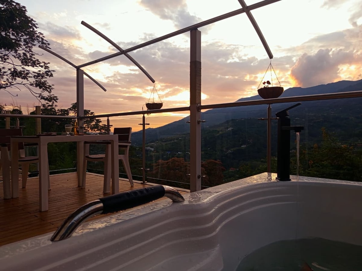 Nido, cabaña u hoy día llamado glamping, está ubicado en un hermoso alto con vista a las montañas y a las luces de la ciudad. El nido, como nos gusta llamarlo, por su forma y sus materiales, fue diseñado a partir de materiales naturales. Construido cien por ciento a mano, como un gran nido. Cómodo, único y seguro. Es un lugar fresco, a la hora de tomar un baño, te sientes libre, a la hora de acostarte, te sientes fuera de lo común. Dotado de una cama doble, nevera, tv, baño privado y jacuzzi.