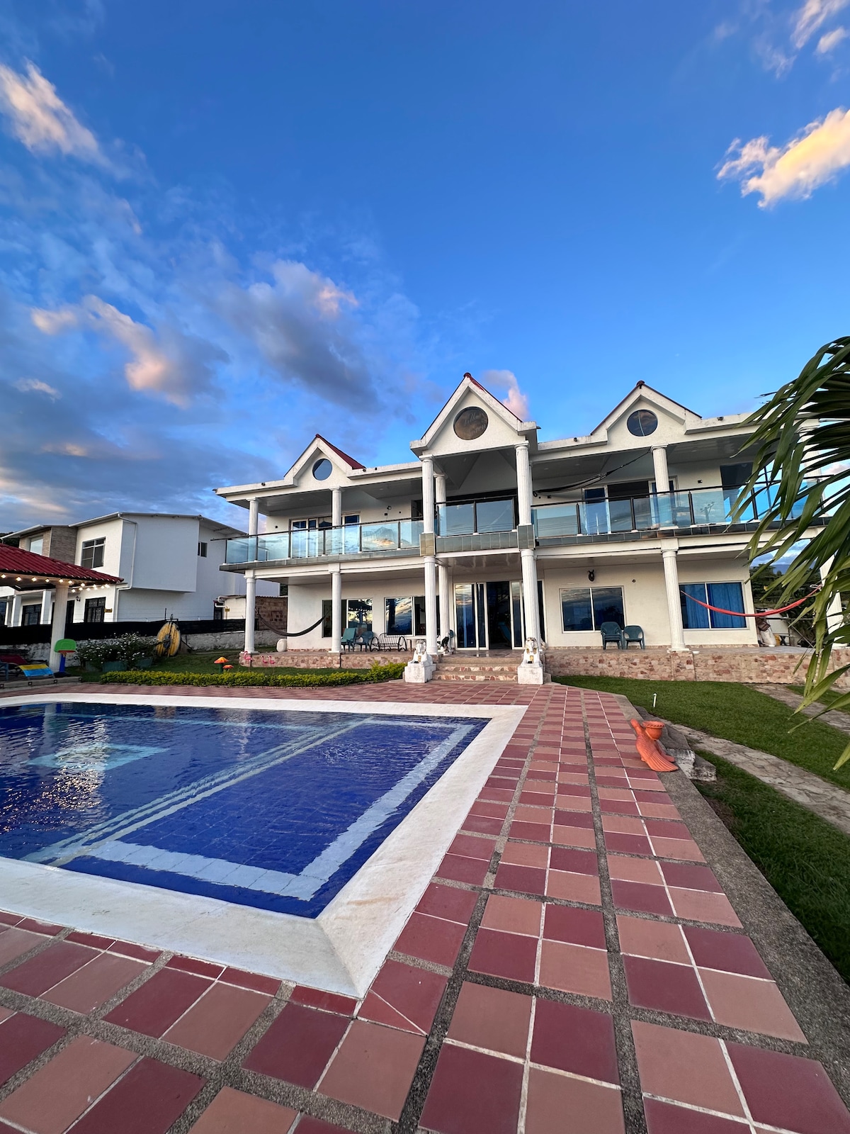 Gran casa recién construida en un nuevo condominio muy cerca de Bogotá con "todos los juguetes". 2 pisos, linda vista, 5 habitaciones, piscina climatizada, 5 Smart TV´s, Wifi fibra óptica, jacuzzi, BBQ, barril de ahumados y horno de pizza, microfutbol, cocina con todo, toallas y linos, deck con malla catamarán, chimenea exterior, pet friendly* No dejes tu viaje al azar. Reserva con la garantía y experiencia de TopSpot®—10 años creando estadías felices en las mejores propiedades del país! 😉