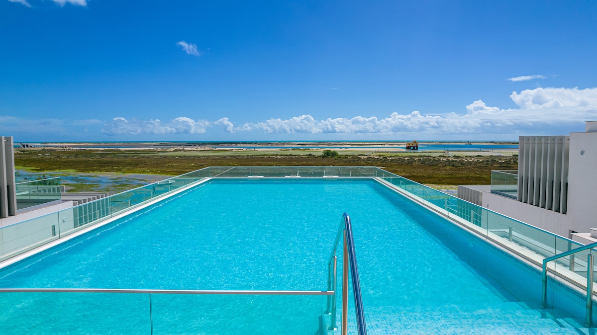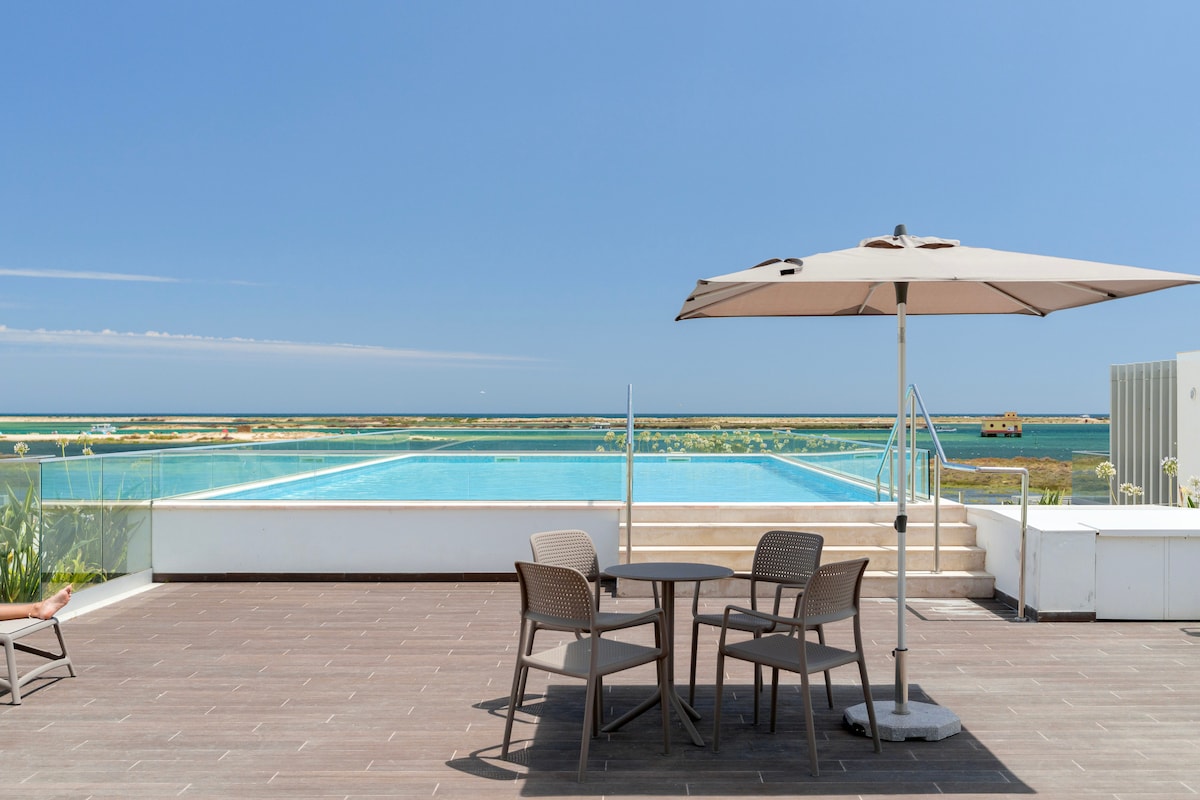 Desfrute de uma estadia exclusiva na Fuseta, Algarve, com vista panorâmica 180° sobre a Ria Formosa com acesso a piscina privada no condomínio. O espaço oferece uma suite deslumbrante, uma sala moderna e cozinha totalmente equipada. Wi-Fi rápido, sistema de som e TV garantem conforto. A poucos passos das praias e da Ecovia do Algarve, é perfeito para desportos aquáticos, caminhadas ou passeios de barco. Excelentes campos de golfe a 20 min. Ideal para relaxar com sofisticação!