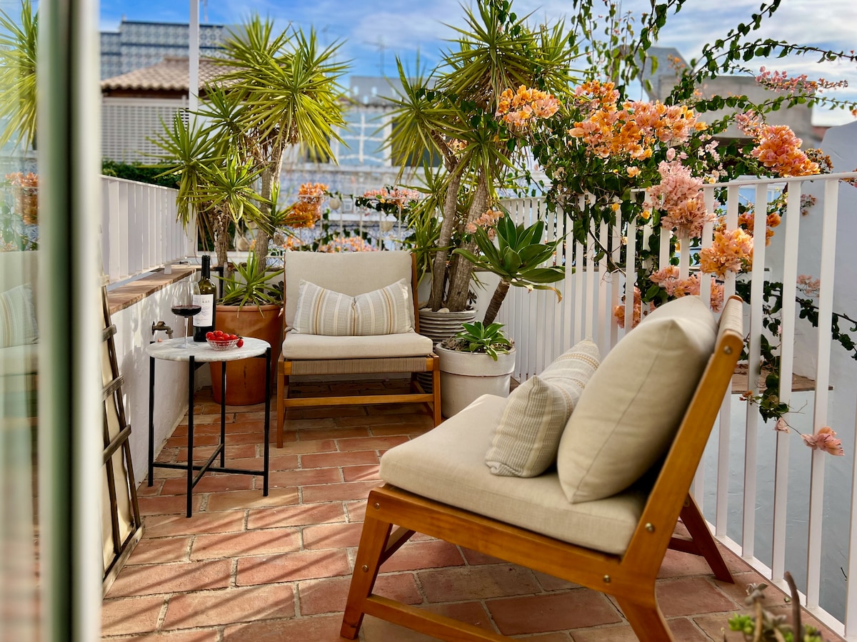 Tucked away on a quiet cobbled street in Tavira’s historic heart, The Water House is a bright, thoughtfully curated apartment with vaulted ceilings, a chef-friendly modern kitchen, and a queen bed with premium linens. A private terrace for two overlooks terracotta rooftops, soft blue plastered walls, and the quintessential hand-painted tiles of the Algarve. A perfect spot to enjoy the setting sun with a bottle of local wine.
