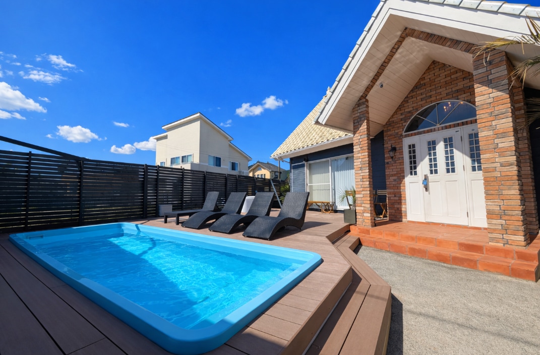 インスタ公開してます sunshine pool villa chiba 🤩🤩🤩 新しくオープンした2号棟は最大10名様まで宿泊可能。 2棟同時予約で最大15名様までご利用いただけます Sunshine pool villa 1 は一棟まるごとお貸しする、別荘スタイルのリゾートヴィラ。 250平方メートル広い天然芝ガーデン、プール、静かな裏庭。 お二人で、ご家族で、気心の知れた仲間たちで。 大切な方と、幸せな時をお過ごしください。 大切な家族の一員のわんちゃんも安心して同伴できます。 乳幼児ための専用入浴用品があります! キッチンや家具・家電を完備しており、ロングステイにもご利用いただけます。 ご滞在中は、お客様だけのプライベートな空間となりますので、ご自由にお過ごしください。 ps:プールは温水ではございません。 位置: 24時間コンビニ 徒步1分、 周辺レストラン 徒歩3分、 ビーチ 徒步10 分(サーフポイントして有名な片貝海水浴