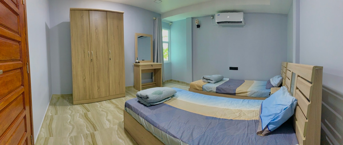 A spacious room with a private bathroom featuring H/C water, from a private residence minutes away from the best sandy beach in the Maldives and world's top tiger shark dive point. Our location is perfect! MLE > FVM > MLE? -Maldivian flight approx. $350 or more, person/return -Is subject to change By car, this residence is; - 10 minutes from the Airport - 15 - 20 minutes to all beaches including "thoondu beach" - 05 minutes to lake and marshland - 10 minutes from diving/snorkeling/fishing