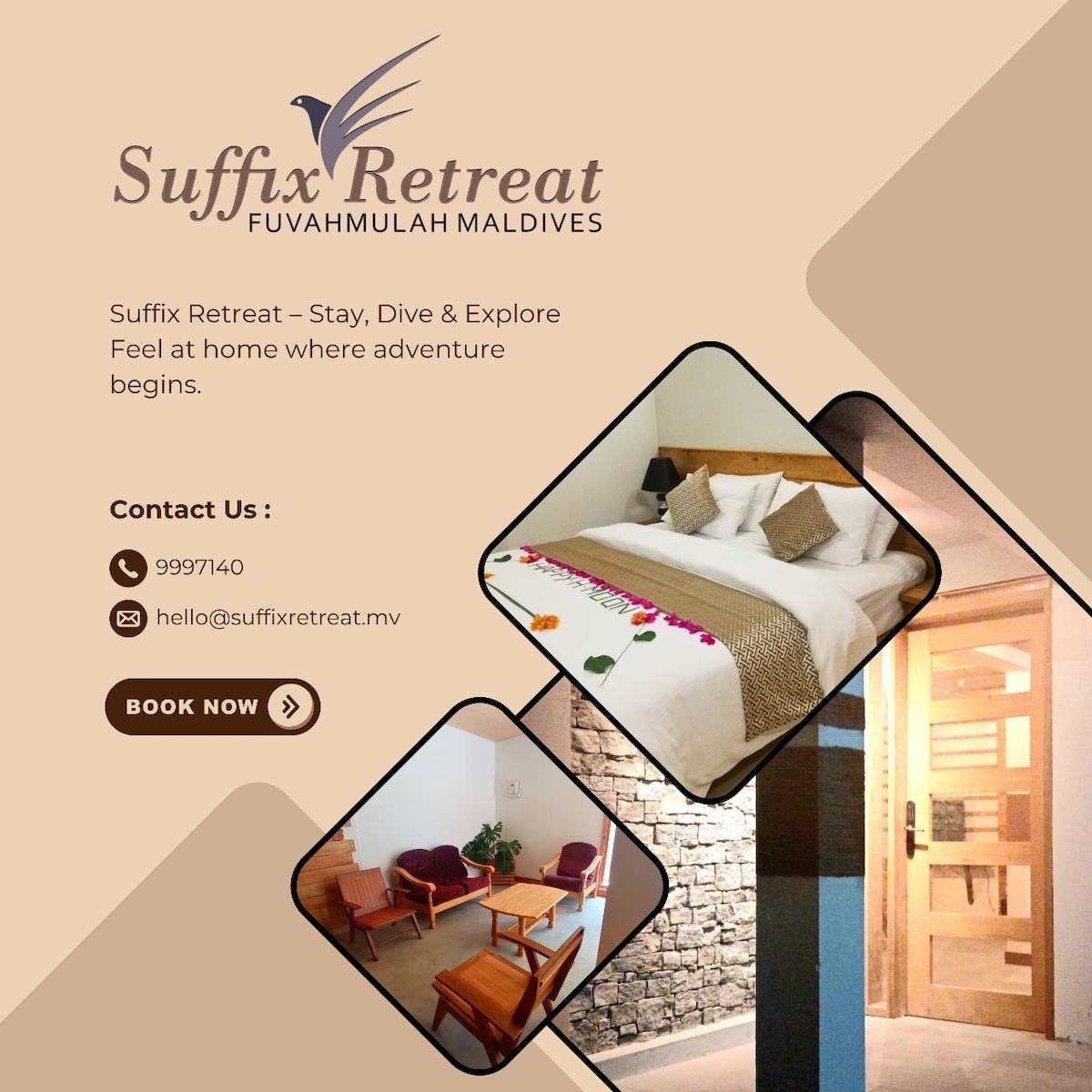 Alafehi Retreat The modern three-bedroom holiday home is designed and built with attention to detail to provide a comfortable, restful experience within an idyllic island setting - as an intimate private space for small families and friends. The living room and bedrooms housed within grand, solid structures are decorated using elegant hand-carved wooden furniture and fittings, and comfortable upholstery.