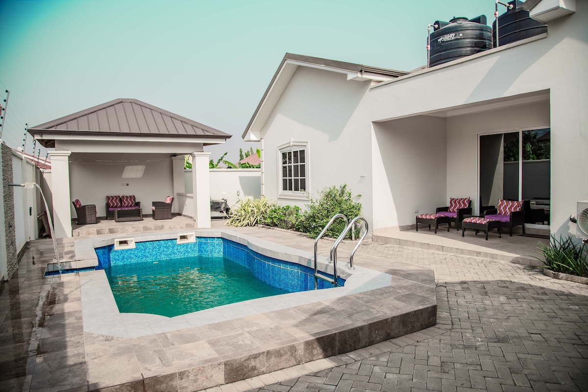 Welcome to a Unique Experience! If you're looking for a beautiful place with a touch of luxury something smart and stylish, complete with a stunning garden, pool, jacuzzi, and gym then look no further. This is the perfect spot for you! Our apartment is ideally situated, within reach of Accra's best attractions. We're just 25 minutes from Accra Mall, 10 minutes from Achimota Mall, and you can reach the beach in only 30 minutes. We are easily accessible from the airport, just 11 km away.