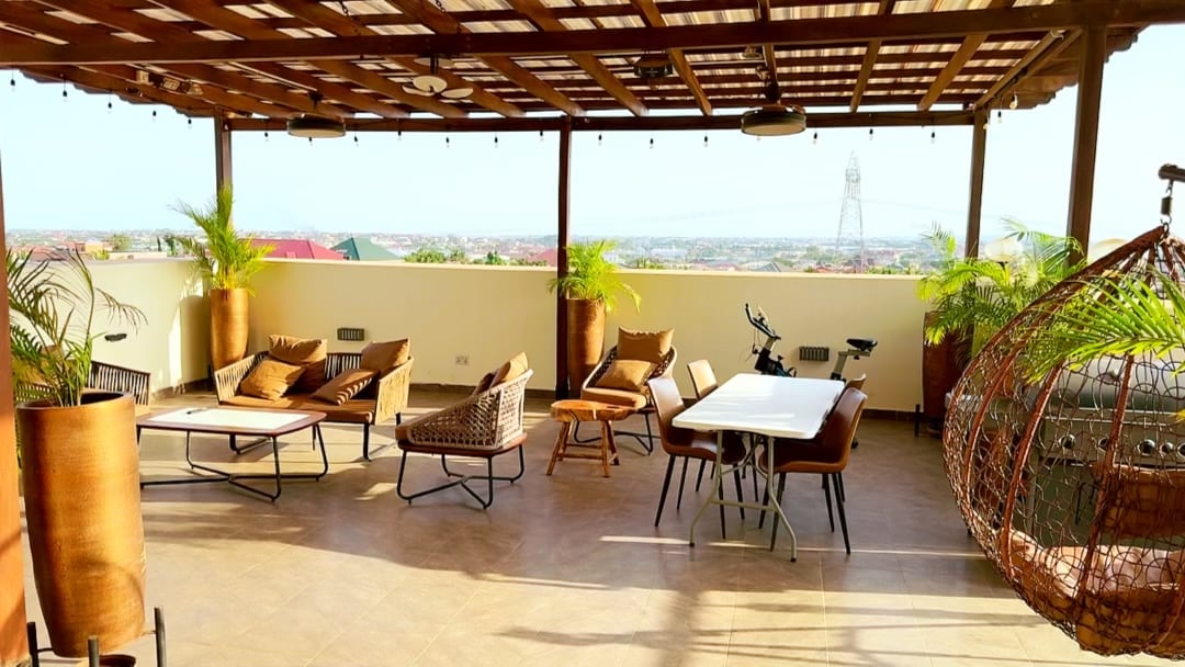 Beautiful, elegantly furnished apartment at Babasab Resort in the hills of Kwabenya, near Ashesi University. Enjoy premium amenities including a swimming pool, bamboo hut with gym, table tennis and foosball, plus a rooftop terrace with panoramic views and BBQ. Features include home theatre, AC, fast Starlink WiFi, solar power and alarm system. Perfect for a relaxing, secure and comfortable stay in a peaceful and scenic location.