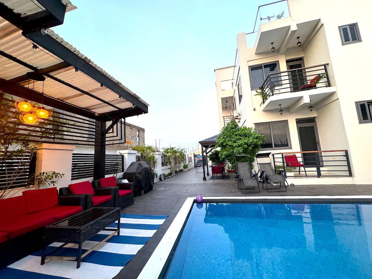 Welcome to a Unique Experience! If you're looking for a beautiful place with a touch of luxury something smart and stylish, complete with a stunning garden, pool, jacuzzi, and gym then look no further. This is the perfect spot for you! Our apartment is ideally situated, within reach of Accra's best attractions. We're just 25 minutes from Accra Mall, 10 minutes from Achimota Mall, and you can reach the beach in only 30 minutes. We are easily accessible from the airport, just 11 km away.