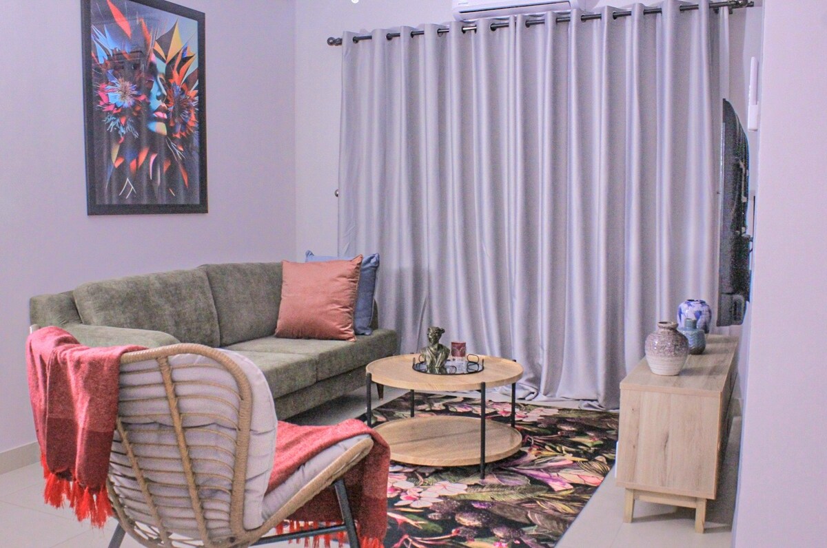Elegant, charming and contemporary apartment in the heart of Gaborone City. 5 minutes walk to the Game City Mall. 12 mins drive to the CBD. Ideal for weekend getaway, business trip, staycation, or cozy home base while exploring everything Gaborone. When ready, enjoy the below amenities that this stylish apartment offers: - Free Parking -Hi Speed Wi-Fi -"55 inch QLED TV - Fully Equipped Kitchen - 2 Cozy bedrooms w/Queen beds -Pool & BBQ area -Washing Machine -24hrs Security