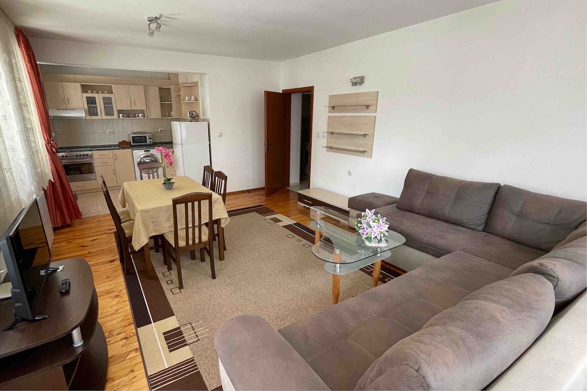 Trinavis Terracotta invites you into a calm, refined space. Just steps from the city’s largest park and a short walk to the old town, this unit offers two bedrooms, two bathrooms, a fully equipped kitchen with dining area, a bright living room, and a private terrace with park and hill views. You’ll enjoy fast Wi-Fi, private parking, gas heating, and air conditioning in every room. Ideal for couples, families, or business travelers,serenity and convenience in Veliko Tarnovo’s best location.