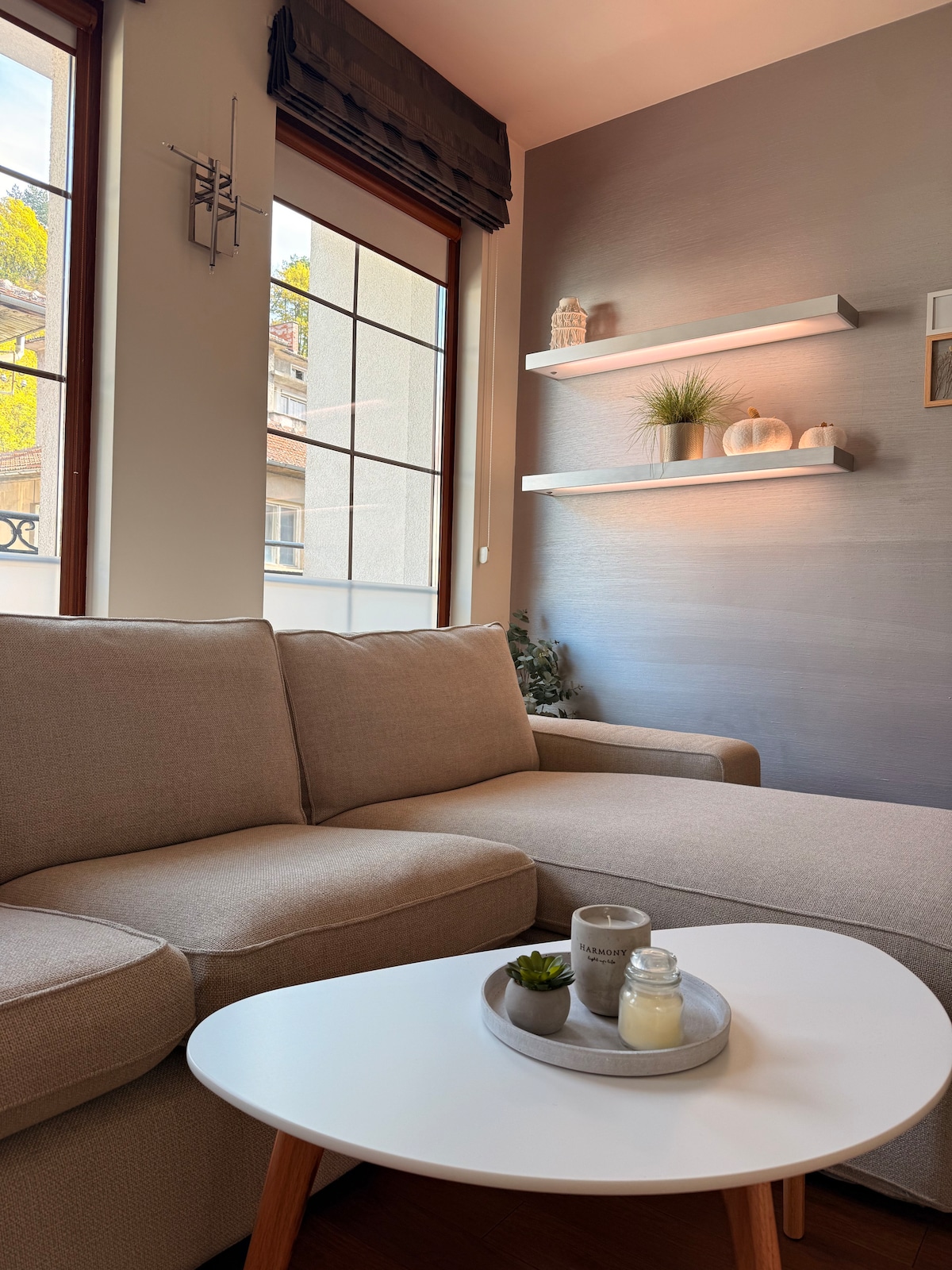 Насладете се на Габрово в нашия стилен двустаен апартамент, намиращ се в сърцето на центъра на града и близо до всичко, от което се нуждаете и искате да посетите. От големите прозорци се открива уникална гледка към река Янтра и планината. Настанете се удобно и се насладете на чаша прясно кафе или чай. Музеите и най-добрият ресторант са само на няколко крачки от апартамента. В близост до няколко по-малки парка и детски площадки, централната пешеходна улица и центъра на града.