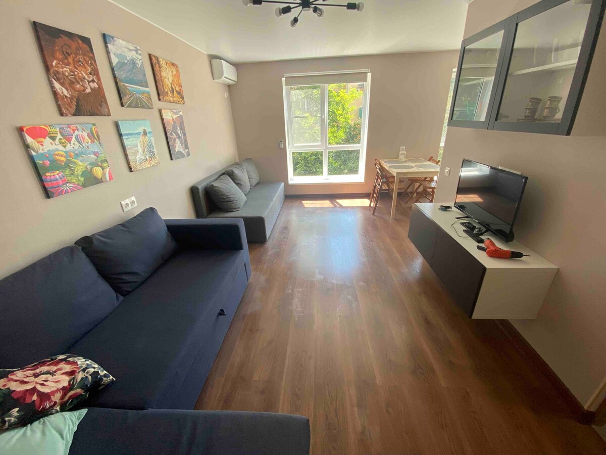 Двухкомнатная квартира-студия в Сухуме. Квартира оборудована всем необходимым для комфортного проживания и отдыха. Произведен абсолютно новый ремонт. Море через дорогу с широким песчаным пляжем. Квартира находится в парковой зоне, поблизости есть магазины, аптеки, пляжный комплекс Мокко, кафе, пацха(где можно вкусно и недорого покушать). На общественном транспорте до самого центра города 12-15 минут, до рынка 17