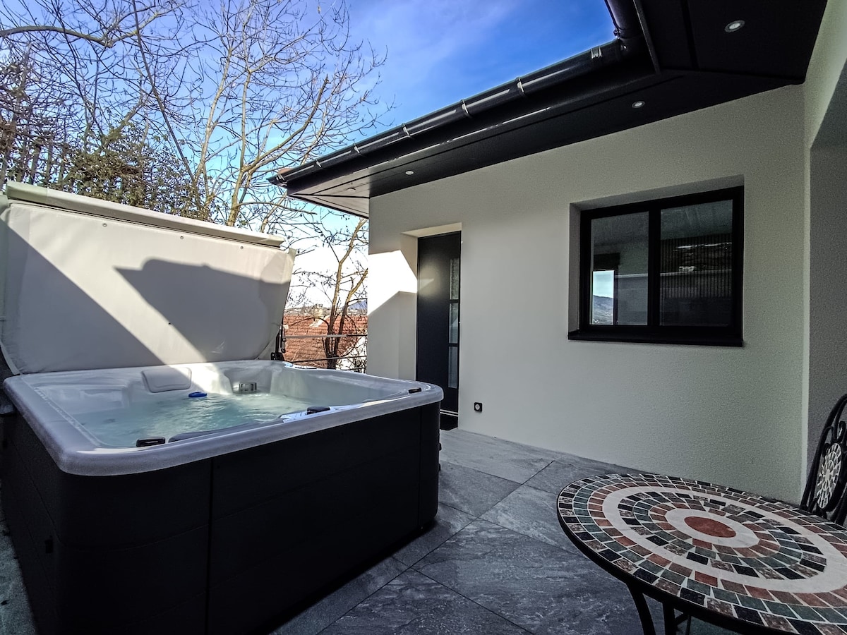 Come and enjoy a unique experience in our city chalet in Annemasse. The apartment is on the top floor, giving you an unobstructed view of the surrounding mountains. After a day of hiking, skiing or working, relax by the fireplace and unwind in the private hot tub. Located 5 minutes from Mont-Salève, 20 minutes from Geneva and 50 minutes from the first ski resorts.