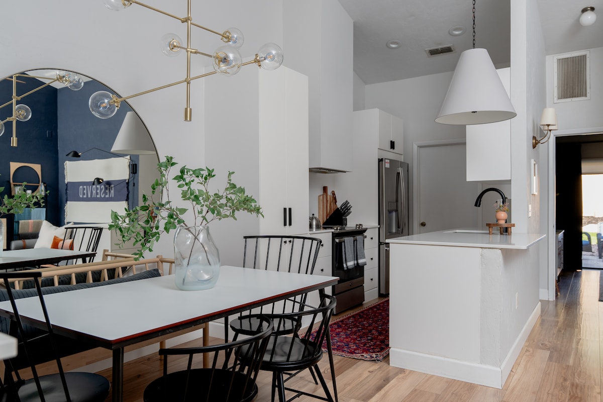 An adorable stay with exceptional value in Gainesville! Beautifully renovated & centrally located with LOTS of personality! ☀️ Double-ensuite floor plan (1 king & 1 queen) with centralized living space ☀️ Private fully-fenced backyard ☀️ String lights and private firepit ☀️ Vaulted ceilings & well-equipped kitchen ☀️ High-end, comfortable mattresses and linens ☀️ High Speed Wi-Fi & desk for remote work ☀️ Single level, no stairs ☀️ PET-FRIENDLY ☀️ 2 miles from UF, Ben Hill Stadium & Shands