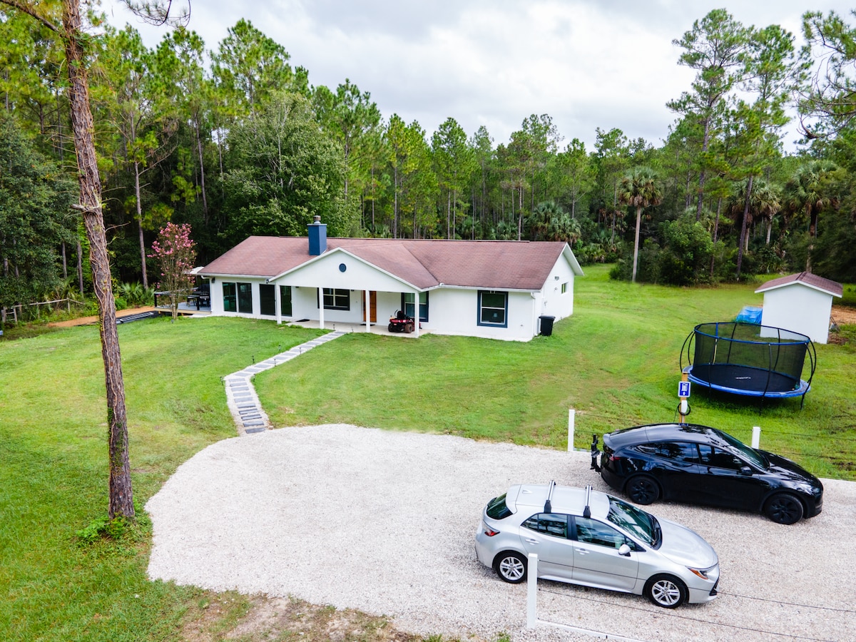 Welcome to River Life! Escape to your perfect countryside retreat just 3 minutes from Ichetucknee Springs’ North Entrance. Our 3-bed, 2-bath home offers privacy, peace, and rustic charm. Enjoy modern comforts, a spacious deck with covered dining and starry nights by the fire pit. Kayak and dive in crystal spring waters, explore nature, or simply unwind. Whether it’s adventure or serenity you seek, this haven offers the best of Florida’s natural beauty and quiet rural life.