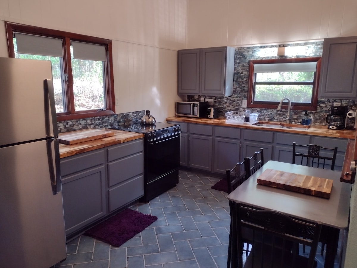 Our front yard is the Santa Fe River. Come enjoy a nature retreat in this cypress log home! Right by Tree House spring and nestled between two state parks, but less than five minutes to downtown. Whether you are looking for rest and relaxation or recreation, our home offers both. Take in the scenery and catch your dinner from the riverbank. Recline in the sunshine on our dock (12’ x 12’). Keep an eye out for otters! It is a two hour float downriver to Poe Springs, Rum Island, and Blue Springs.