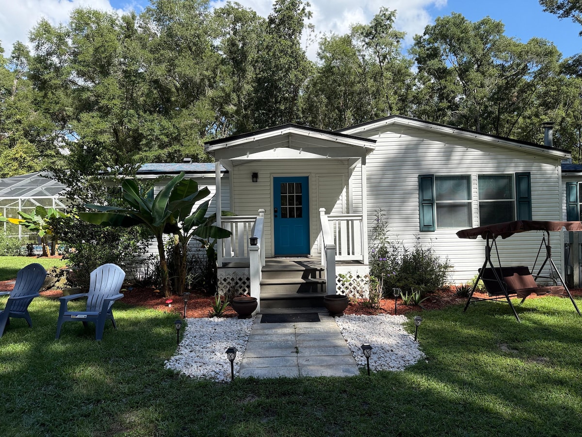 We are meticulous about cleaning, now more than ever. Doorknobs, faucet handles and light switches are being thoroughly sanitized between guests. Your health is a priority! 1 bedroom 1 bath apartment, near UF & thd airport, full kitchen and bath. Very comfortable queen sized bed. Beautiful living room and breakfast bar w/ great lighting throughout. Quarter mile nature trail through 5 acres of magnolias, oaks & ancient pines right outside the front door. Enjoy the real Florida!