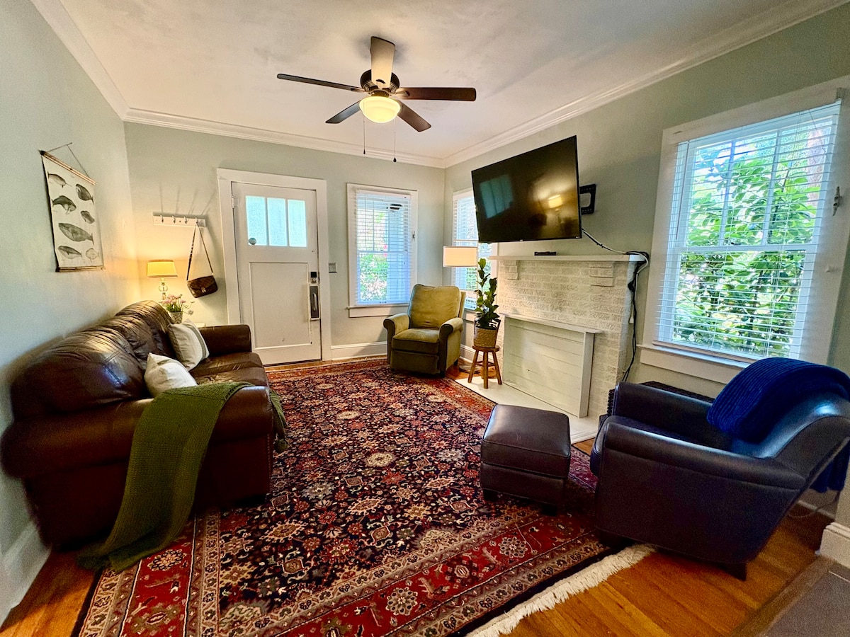 This 1940s cottage offers all the modern conveniences of a contemporary home. The bedrooms are spacious with walk-in closets, and the beds features plush Egyptian cotton sheets. The bathroom has a deep tub and a double vanity. The living room features a 60-inch 4k television with my Netflix, Max, and YouTube TV accounts logged in and ready for your screening pleasure. The kitchen is totally modernized with a large refrigerator, oven/range, and dishwasher.
