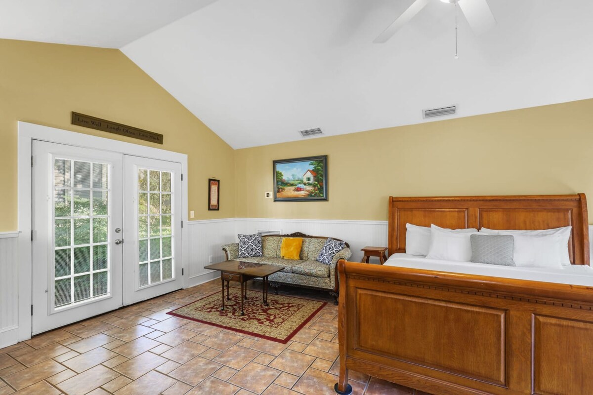 100% Private bedrm, bath, entrance, code & parking! Hanes Haus on historic Main St.! Shops, spas, tea room, dining, etc. Close to I-75. TOU 4 mi. Dwntn Gainesville 15 min. Near 4 Springs Dine in room or alfresco. Qn bed, lrg bathrm & 18ft skylight over tub. Well Equipped kitchenette. Coffee, cream oats. R.O. water. QUIET AC. Fanimation fan/light. Smart TV(remotes for all!) Ded. WIFI, ADA ramp. Wheel luggage from car to room, all flat. Secure, fenced, 1/2 acre on Safe Norman Rockwell-ish street!